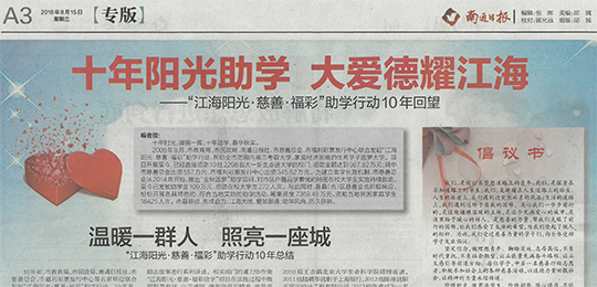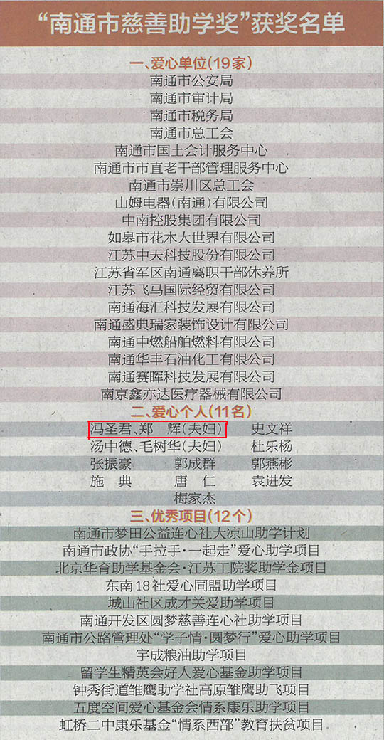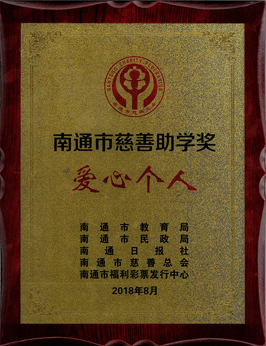 2018年8月15日,南通市教育局、南通市民政局、南通日報(bào)社、南通市慈善總會(huì)、南通市福利彩票發(fā)行中心公布了“南通市慈善助學(xué)獎(jiǎng)”評(píng)選結(jié)果,南通三圣石墨設(shè)備科技股份有限公司董事長馮圣君、鄭輝夫婦榮獲“南通市慈善助學(xué)獎(jiǎng)愛心個(gè)人”光榮稱號(hào),全市僅有11人獲此殊榮。