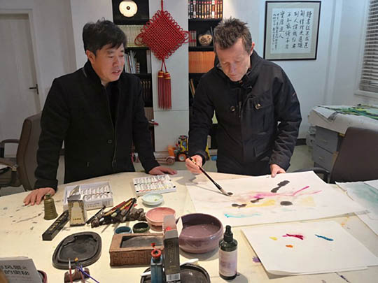 當(dāng)代藝術(shù)的杰出代表、瑞士巴塞爾著名藝術(shù)家chris先生,也是首次來到中國,用他的話說,來到了三圣就有回家的感覺,一切是那么的自然、美好。他欣然在三圣畫室創(chuàng)作兩幅作品留念。