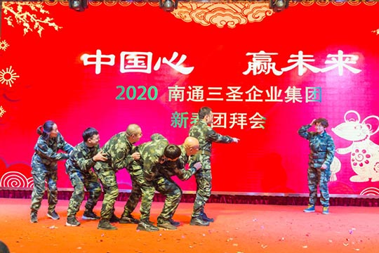為了弘揚(yáng)體育健身精神,本次年會(huì)上凸顯對(duì)“體育強(qiáng)則中國(guó)強(qiáng)”的高度關(guān)注:曾參加今年“南通國(guó)際馬拉松”賽事的三圣健將們,高舉國(guó)旗、彩球,插上雙翼、身披戰(zhàn)袍,用自己的特殊方式,威風(fēng)凜凜地依次入場(chǎng);彩虹跑小組成員也自信亮相,搞怪機(jī)靈的鼠大哥帶著鼠弟鼠妹接過(guò)豬師兄的接力棒開啟了2020新大門,合唱合舞燃爆現(xiàn)場(chǎng)。