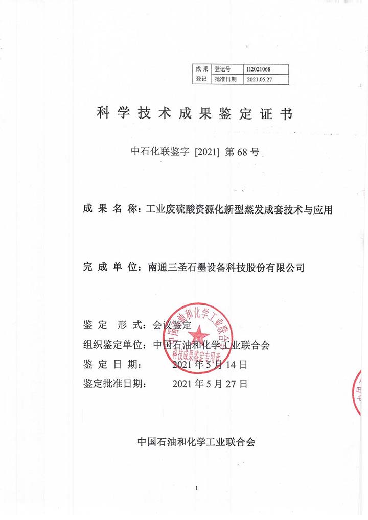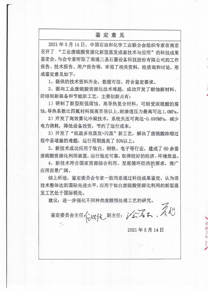 2021年5月27日,中國(guó)石油和化學(xué)工業(yè)聯(lián)合會(huì)批準(zhǔn)了南通三圣石墨設(shè)備科技股份有限公司“工業(yè)廢硫酸資源化新型蒸發(fā)成套技術(shù)與應(yīng)用”的科技成果鑒定,由南京大學(xué)任洪強(qiáng)院士擔(dān)任主任,華東理工大學(xué)涂善東院士、南京工業(yè)大學(xué)喬旭校長(zhǎng)擔(dān)任副主任的鑒定委員會(huì)專(zhuān)家一致認(rèn)為,該技術(shù)整體達(dá)到國(guó)際先進(jìn)水平,應(yīng)用于鈦白廢硫酸資源化利用的新型蒸發(fā)工藝處于國(guó)際領(lǐng)先。