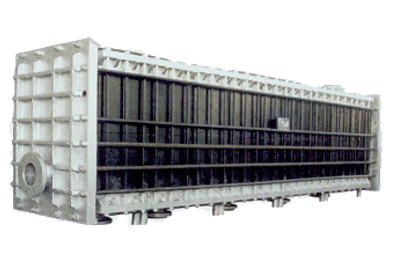 新型矩型塊孔自流式偏鈦酸石墨冷卻器由矩型石墨封頭、石墨換熱塊及其間的密封墊片等迭裝組成,因換熱塊僅承受壓力并為整體結(jié)構(gòu),無膠結(jié)縫,因而結(jié)構(gòu)強度較高,抗沖擊性良好。水封側(cè)板為鑄鐵板,檢修裝拆簡便,也可制成雙向防腐結(jié)構(gòu),該設(shè)備物料單塊一流程,冷卻水側(cè)為1-4流程。